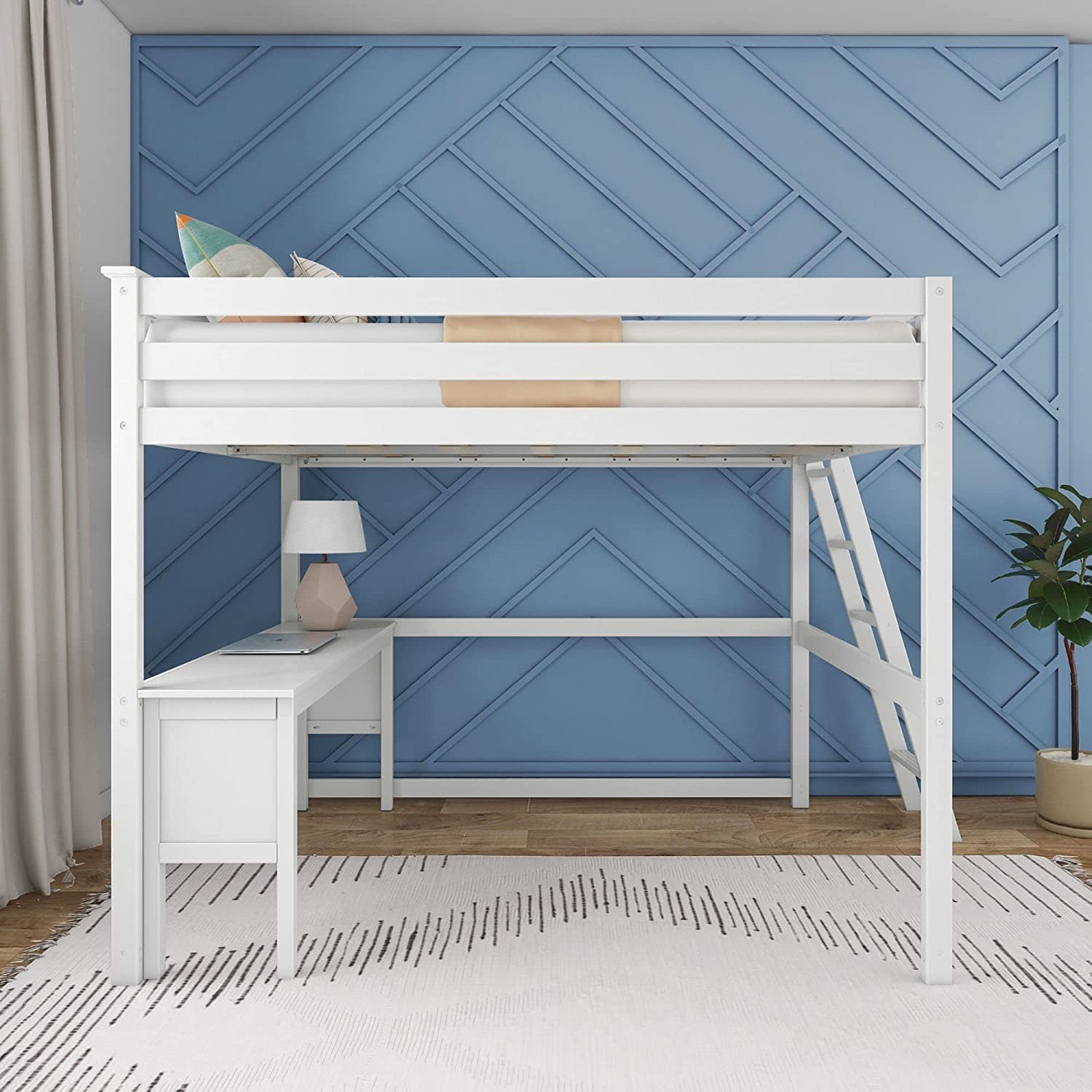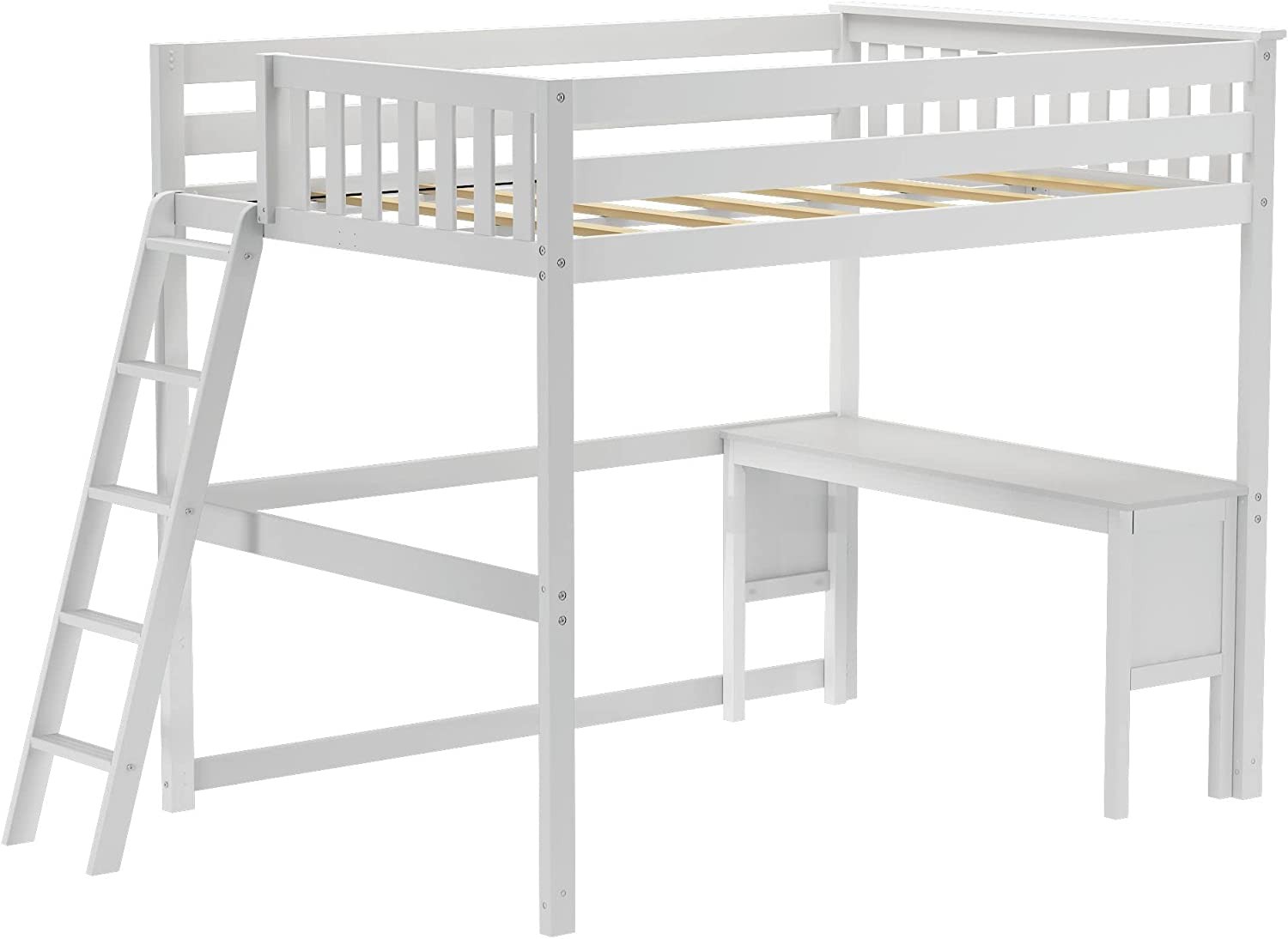 • Full Loft Bed with Desk and Ladder on End: This loft bed for kids is great for maximizing space in your room; Ladder on end fits neatly in your room while giving greater access to the under-bed space; Solid wood desk creates the perfect study zone